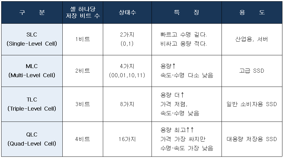 - 셀 1개에 몇 비트를 저장하느냐에 따라 SLC / MLC / TLC / QLC 로 구분된다