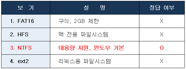 문제 37. 윈도우 10을 사용하는 컴퓨터에서 보조기억장치에 동영상 자료 저장을 위하여 별도의 파티션을 구성하였다. 그런데 4GB 이상의 자료를 저장하지 못하는 문제가 발생하였다면 파일시스템을 무엇으로 변경해야 하는가?"