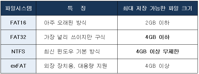 용량이 아무리 남아 있어도 단일 파일 크기가 4GB를 넘으면 저장이 안 되는 것이에요.