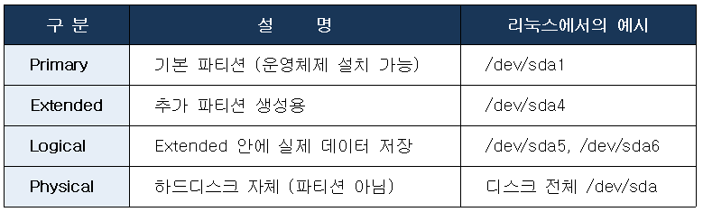 - 리눅스에서는 /dev/sda5, /dev/sda6 같은 이름으로 표시돼요.