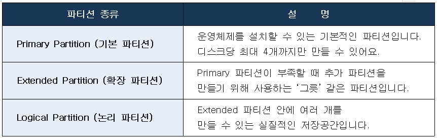 - 논리적 파티션(Logical Partition) → 물리적 저장공간을 나누어 만든 가상의 구역