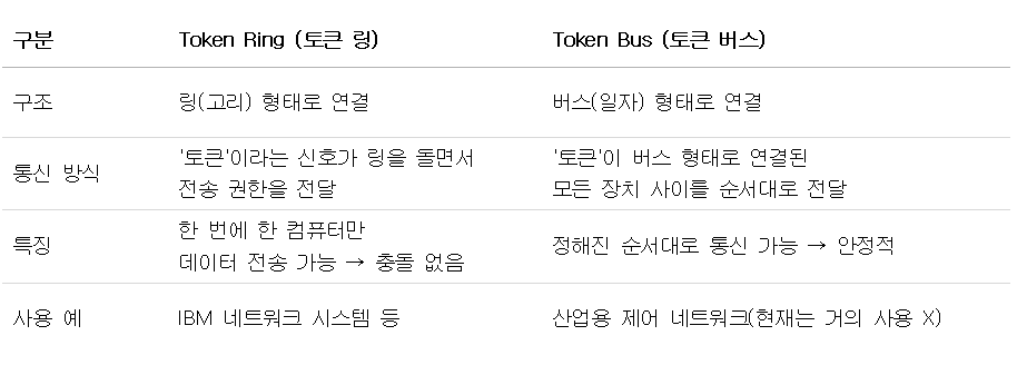 🔹 ⑤ Token Ring(토큰 링)과 Token Bus(토큰 버스)