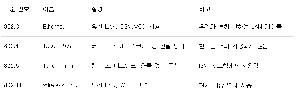 지금은 대부분 Ethernet(802.3)과 Wi-Fi(802.11)로 대체되었어요.
